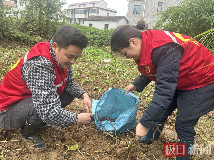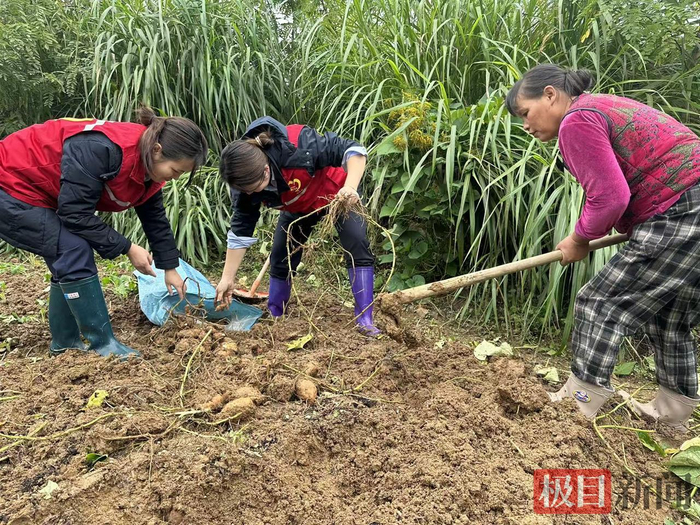 志愿者在幫忙挖紅薯 11月7日一早,天公作美,前一天下了一整天的雨終于停了,雖然路上都是泥濘,沼山管理所十多名志愿者扛起鋤頭趕到了夏菊英家的紅薯地頭,他們二話不說擼起袖子,手持鋤頭便挖起了紅薯剛從地里挖起來的紅薯需要清理泥土、收集裝袋,大家干得熱火朝天。