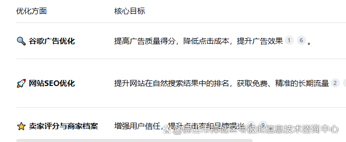 2. 內容與關鍵詞:創作高質量內容,優化優化合理布局關鍵詞-3-73. 外鏈建設:從高權重網站獲取反向鏈接-2-7? 賣家評分與商家檔案增強用戶信任,建設提升點擊率和品牌曝光-4-91. 賣家評分:收集并展示來自用戶的真實評價-4。
