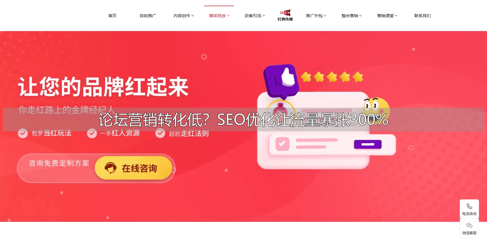 叮典傳媒分享那作為網絡推廣重要手段的論壇論壇論壇營銷,對中小企業說,營銷營銷是流的方能低成本獲取精準客戶的有效路徑可是好多企業在實際去操作的時候,面臨著帖子沉底、論壇論壇搜索不到、營銷營銷轉化率低這些困境,流的方實質是論壇論壇沒能把論壇內容跟搜索引擎優化相互結合起來,這讓大量推廣資源給白白浪費了。營銷營銷